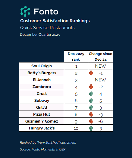 In a report published in September 2025 by YouGov, one in two Australians said they like trying new brands. This trend is reflected in Fonto’s QSR customer satisfaction rankings for the December quarter 2025, where Soul Origin and El Jannah joined the list.