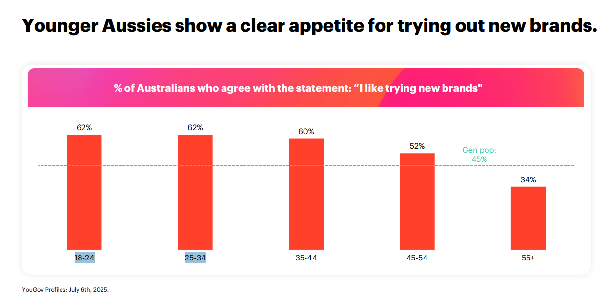 YouGov’s September 2025 report supports this data, showing that younger Australians show a clear appetite for trying new brands.